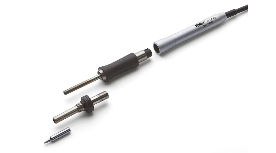 Ciocanul de lipit WXP 90 se remarcă prin atingerea temperaturii de lipit rapid, și precis. Puterea de 80W face ca timpul de încălzire să fie extrem de rapid și dinamic. Datorită formei sale subțiri și a distanței scurte dintre vârful de lipit și mâner, este ideal pentru lucrări de lipire extrem de fine. Ciocanul de lipit este echipat cu senzor de mișcare, a cărui sensibilitate poate fi reglată din meniul surselor de alimentare Weller seria WX. Ciocanul de lipit începe a se încălzi imediat ce este scos din suport. Atunci când temperatura setată s-a atins LED-ul integrat în ciocanul de lipit rămâne aprins continu. Datorită designului hibrid, vârful de lipit (și/sau elementul de încălzire ) poate fi înlocuit ușor și rapid. Acest aspect face de asemenea munca mai eficientă. Elementul de încălzire și senzorul de temperatură ajung până la capătul vârfului de lipit,asigurând încălzirea rapidă și controlul precis al temperaturii oferind o funcționare mult mai rentabilă în comparație cu modelel de vârf activ. Setarea temperaturii de așteptare și setarea timpilor de comutare pot fi găsite în instrucțiunile de utilizare ale sursei de alimentare respective