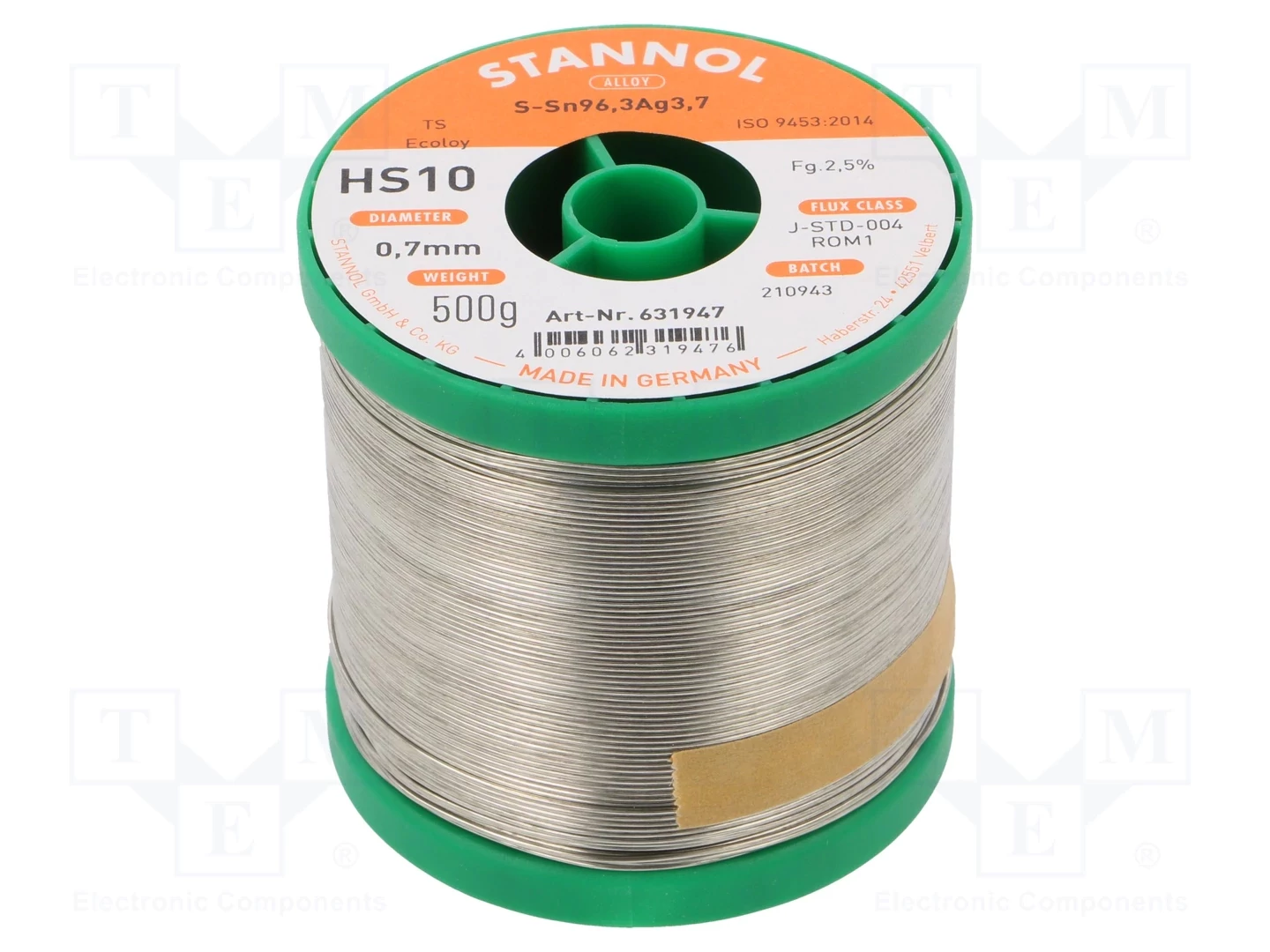Sârma de lipire HS10 a fost dezvoltat pentru a satisface cerințele de înaltă calitate în producția electronică industrială, precum și în reprelucrarea rapidă. Cositorul de lipit electronic HS10 este un produs dovedit și de încredere al cercetării Stannol, care a fost dezvoltat pentru a îndeplini cerințe de calitate în producția electronică industrială, precum și pentru reluare rapidă. Firul de lipit de tip HS10 este foarte eficient prin activitatea sa ridicată, care are ca rezultat răspândirea rapidă a reziduurilor de lipire și electrice sigure.
